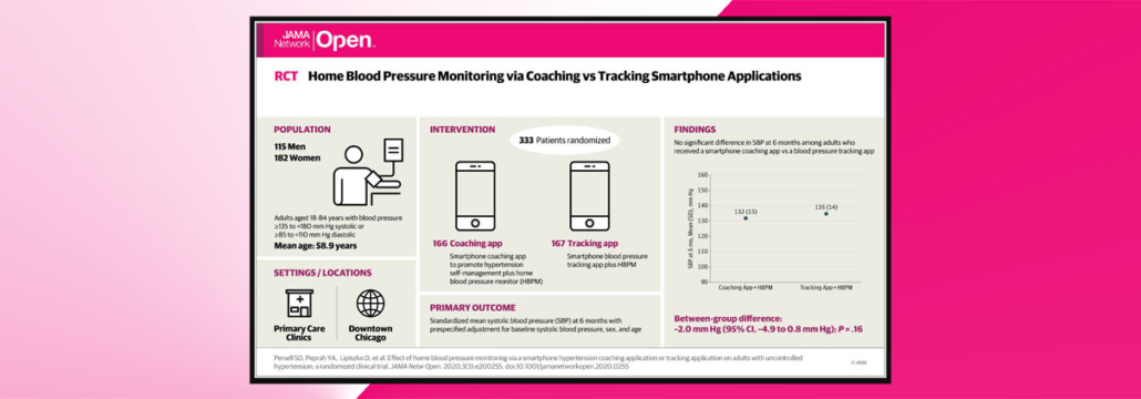 In the examination of a smartphone application to help lower blood pressure, the results were a little surprising. Take a look at the graphic representation above of the study, including the results. More and more journals are going to that type of graphic summary. They’re great summaries, but they don’t always tell the entire story.