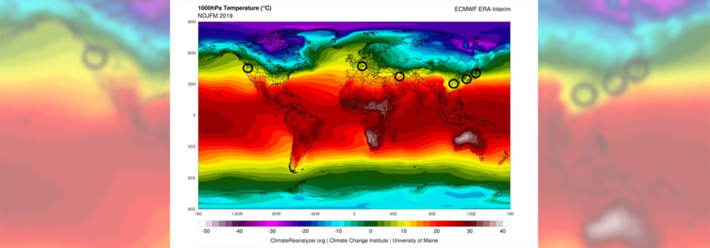 Several virus researchers tracked the path of the virus as it has spread. They focused on a specific weather path within the northern parallels at 30-50 N”—the lime green path in the graphic that shows weather from November 2018 to March 2019 (assuming the weather has been similar this year). When you look at the clusters of cases within specific temperatures (41°F to 52°F) and humidity percentages (47% to 79%), it seems reasonable. It was interesting to me that it’s not a straight line around the earth; as the temperature and humidity vary slightly from location to location, so do the clusters. That doesn’t mean there are no cases outside of that area, but they may have been carried from the clusters out, called community spread, which is unpredictable.